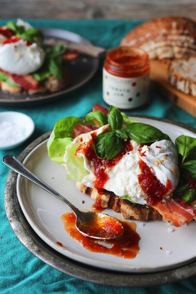 Open Faced Burrata BLT Sandwich with Lettuce, Bacon, Basil and Tomato Jam